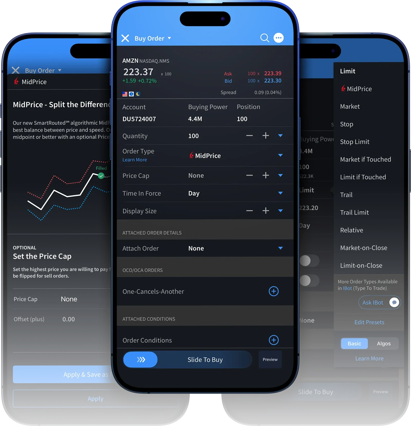 Place trades with the same professional features available on desktop, including advanced order types, algorithmic trading, and flexible routing options.